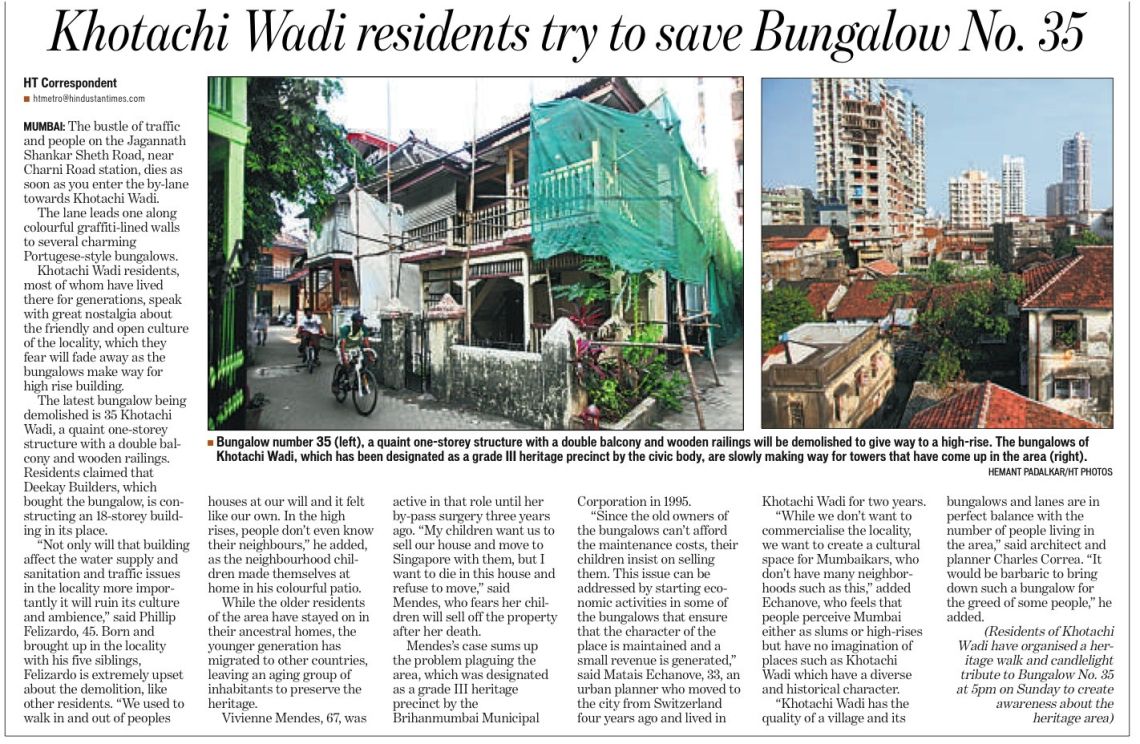 “Khotachi Wadi has the quality of a village and its bungalows and lanes are in perfect balance with the number of people living in the area,” said architect and planner Charles Correa. “It would be barbaric to bring down such a bungalow for the greed of some people,” he added.