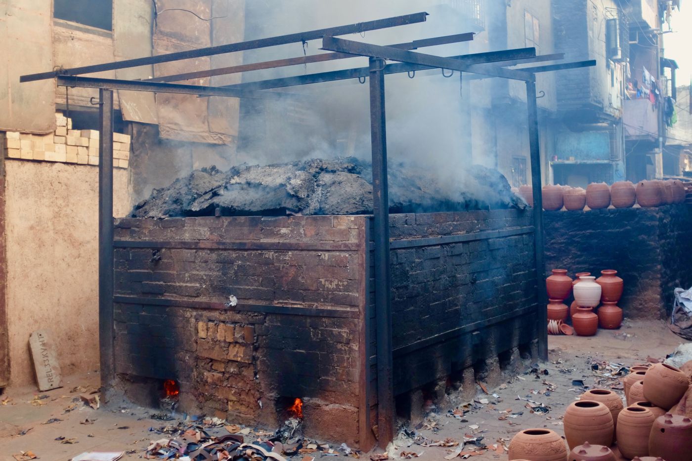 The traditional kiln consists of a brick box with an opening at the top, and a suspended floor made of tiles. When ready to fire, pots are stacked in the kiln, then covered in swabs of cotton, which hold in the heat. Fabric scraps are stuffed into the space under the suspended floor and lit. These scraps are offcuts from the local textile industry, and include composite fabrics with a high plastic content, which explains why the smoke is so pollutant. It seeps through the gaps between the cotton, which the potters peek through to check on their wares. The kilns are usually loaded in the evening and fired the next morning, before being unloaded in the afternoon.
