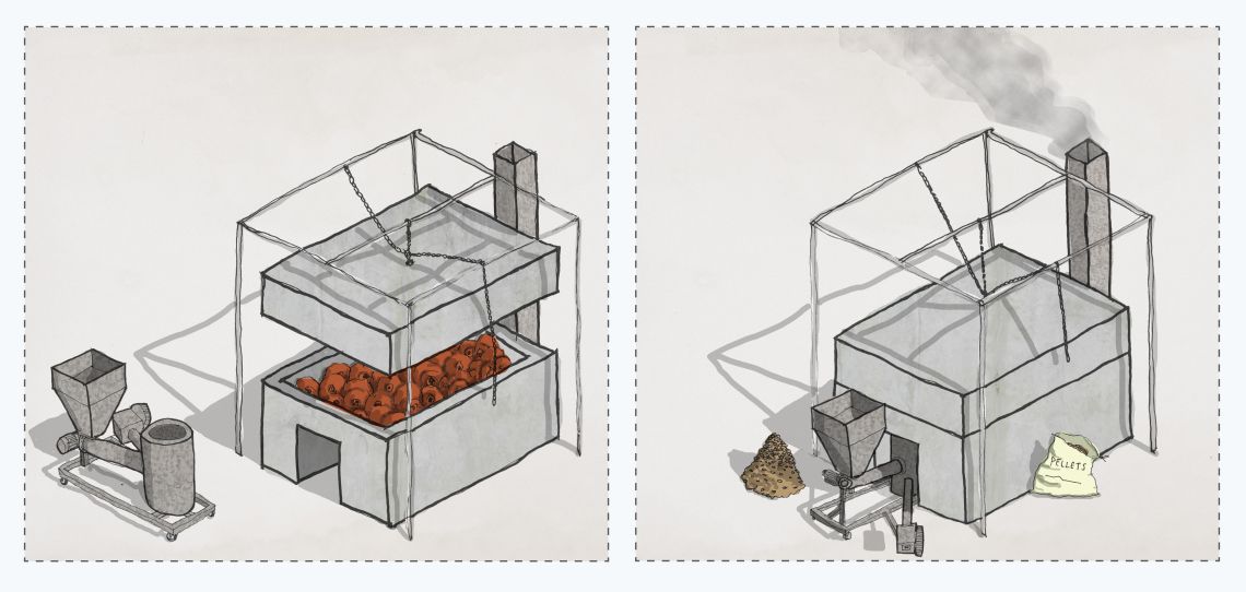 A new type of kiln has emerged in the last four months, with seven of them now built. For years, locals have been trying to think of ways to deal with the pottery industry’s smoke, perhaps aware of the story of Dharavi’s leather tanneries, which were forced to relocate after creating too much pollution. Around a year ago, a group of five potters discovered a furnace that burns biomass pellets, shared on YouTube. In this case, it was intended to heat ovens for baking pav buns, or oil to fry snacks. Biomass fuel creates very little smoke and so it appealed to the potters in Kumbharwada, who decided to build a kiln using this system. They adapted the pav oven, birthing a new eco-kiln. It looks quite similar to the traditional model, but it has a solid lid opened with a pulley. A furnace slots into a hole in the side of the structure and is fed with pellets from a hopper. A chimney sucks the little smoke that’s produced away from the public spaces at ground level. This kiln costs a total of around ₹2.5 lakh, compared to around ₹20,000 for a normal kiln.