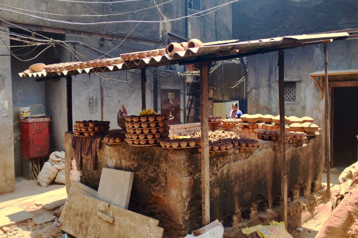 First, let’s talk about the infrastructure needed to make pots and how it’s done. Kumbharwada is always full of activity, dissipated through its narrow alleyways and lanes (called wadis). Everyone plays their role within a highly optimised network. The most important and influential actors are the business owners, usually potters, who live and work onsite. They own the kilns and run the workshops dotted around them. Teams of labourers assist these entrepreneurs to throw pots, and are charged with firing and finishing them.