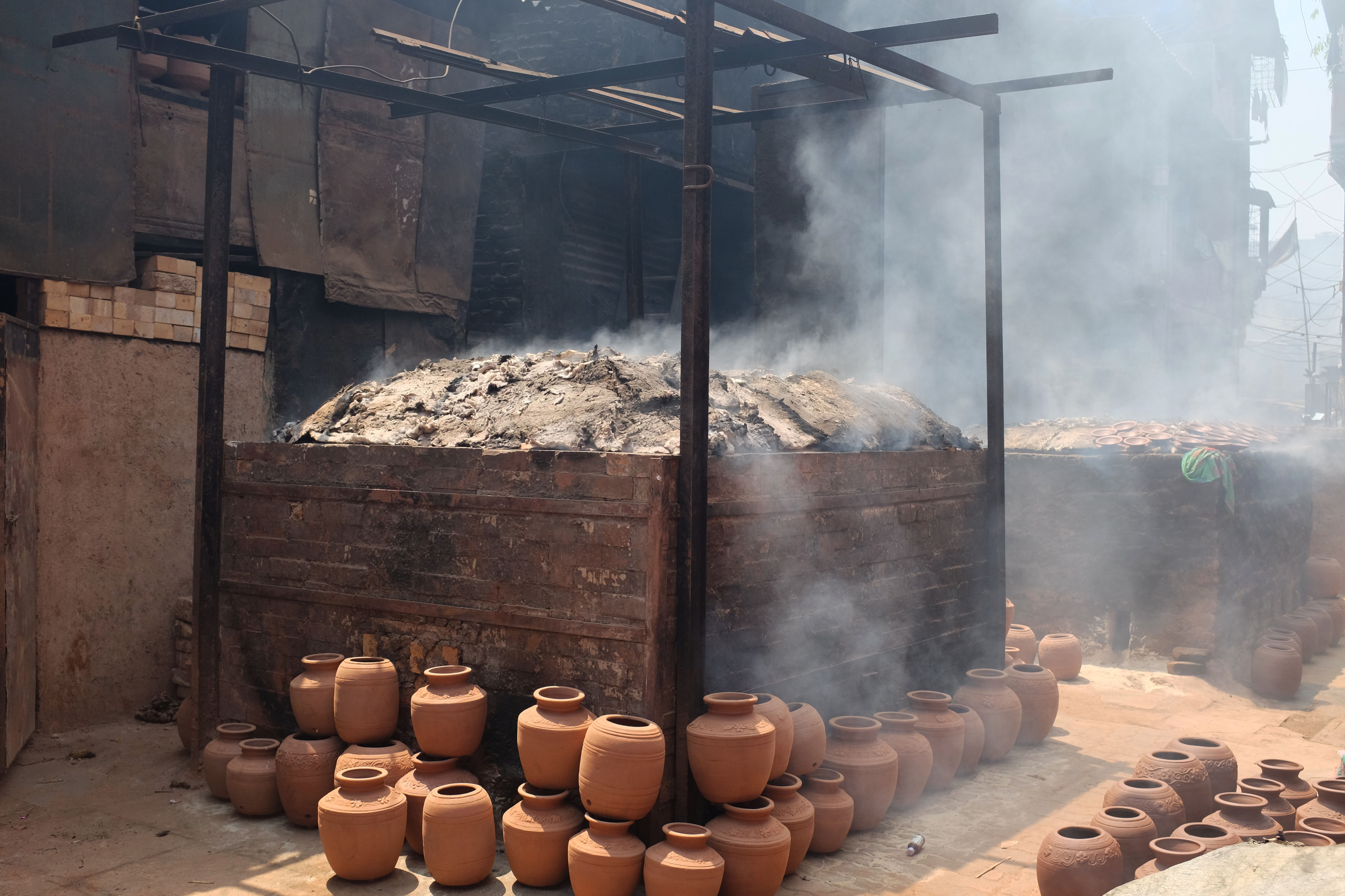 Kumbharwada is one of the first settlements in Dharavi, built by migrants from Gujarat in the second half of the 19th Century. It’s home to the pottery industry, one of Dharavi's most famous local crafts. In the small gaps between their houses, artisans throw and fire pots of all shapes and sizes, from small cups for yoghurt to diya candles, larger water pots or ornamental vases. The potters brought their family trade with them, and maintain – like many in Mumbai – strong ties to their ancestral villages. They’re in constant communication (physical and online) with their families in the North, collaborating to improve kiln designs, visiting their villages regularly, and significantly, importing their clay from there.