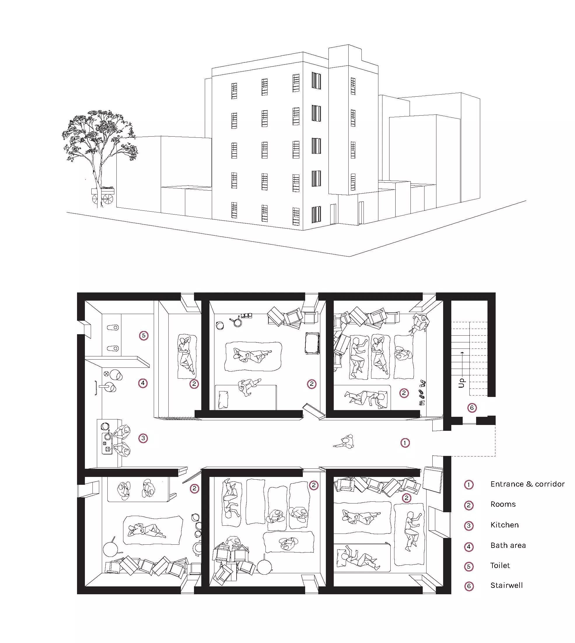 This specific typology is part of an old lineage of urban housing, for instance, the Mumbai ‘chawls’—workers barracks—or even the ‘kuds’ or clubs of Goan migrants to Mumbai that still exist in the city. When seen through an even broader lens, the typology can be connected to other forms of temporary accommodation meant for short and long-term visitors to cities. Indeed, mess housing, chawls and kuds share a kinship with hostels, dorms and army barracks with their common toilets and facilities. According to Dasgupta, mess housing is now very much part of Dhaka’s urban fabric and is here to stay. Its arrangements are diverse. They are usually exclusively for male, female or for families.