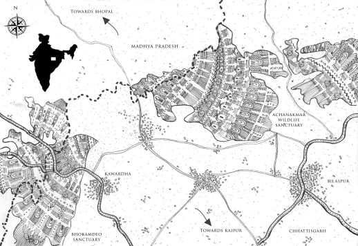 The Baiga and Gond tribes, which are present in the area depicted on the map, just like other nomadic and semi-nomadic communities, traditionally relied on knowledge of the forest for their livelihood. They had advanced cultivation techniques, which used the forest produce while allowing it to regenerate. They sourced locally woven fabrics and traded with other communities. Their art produced a distinctive style, which was central to marking their identity and territory. The Gonds even had a kingdom, some of whose proud descendents live in an elegant palace in Kawardha.