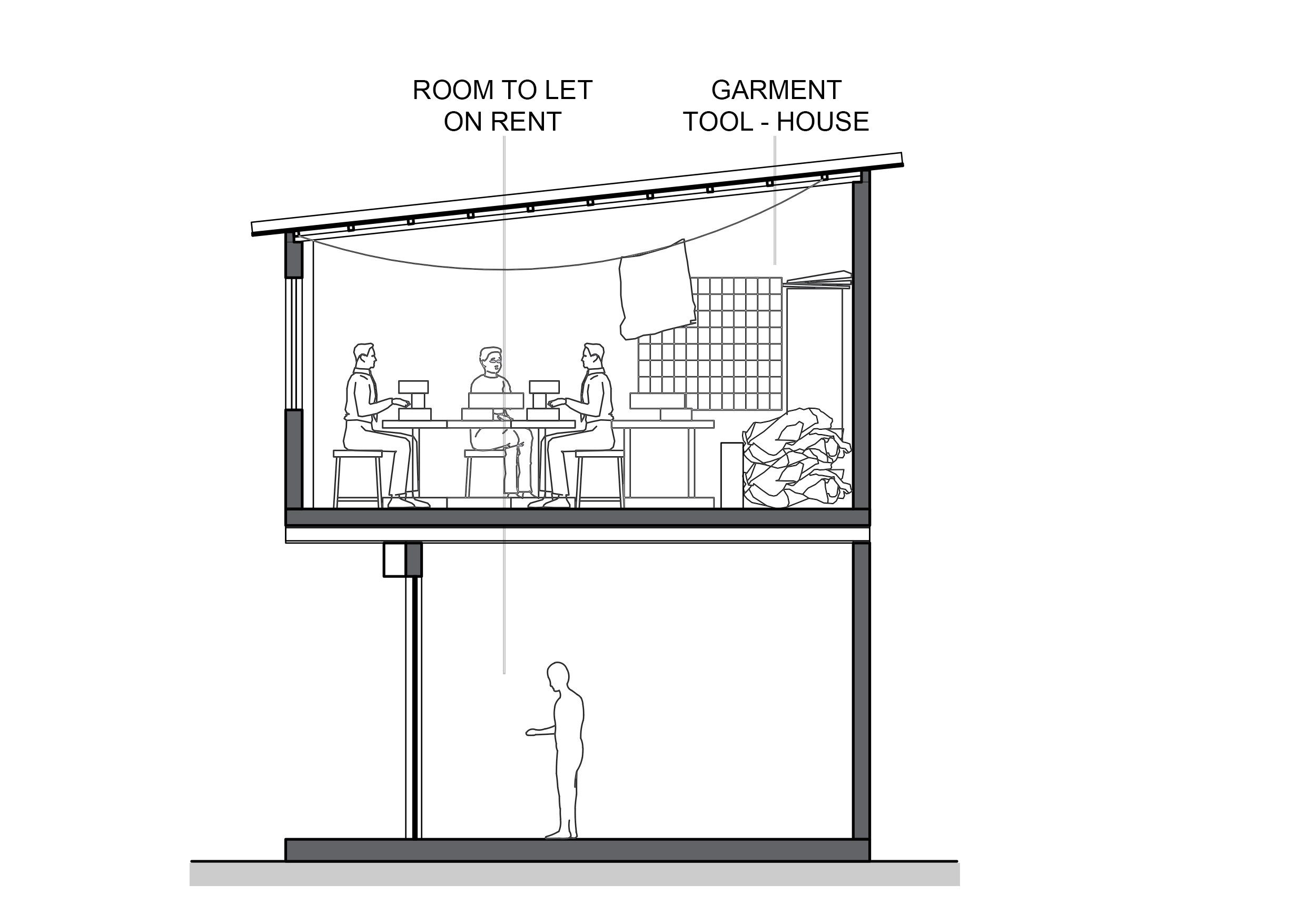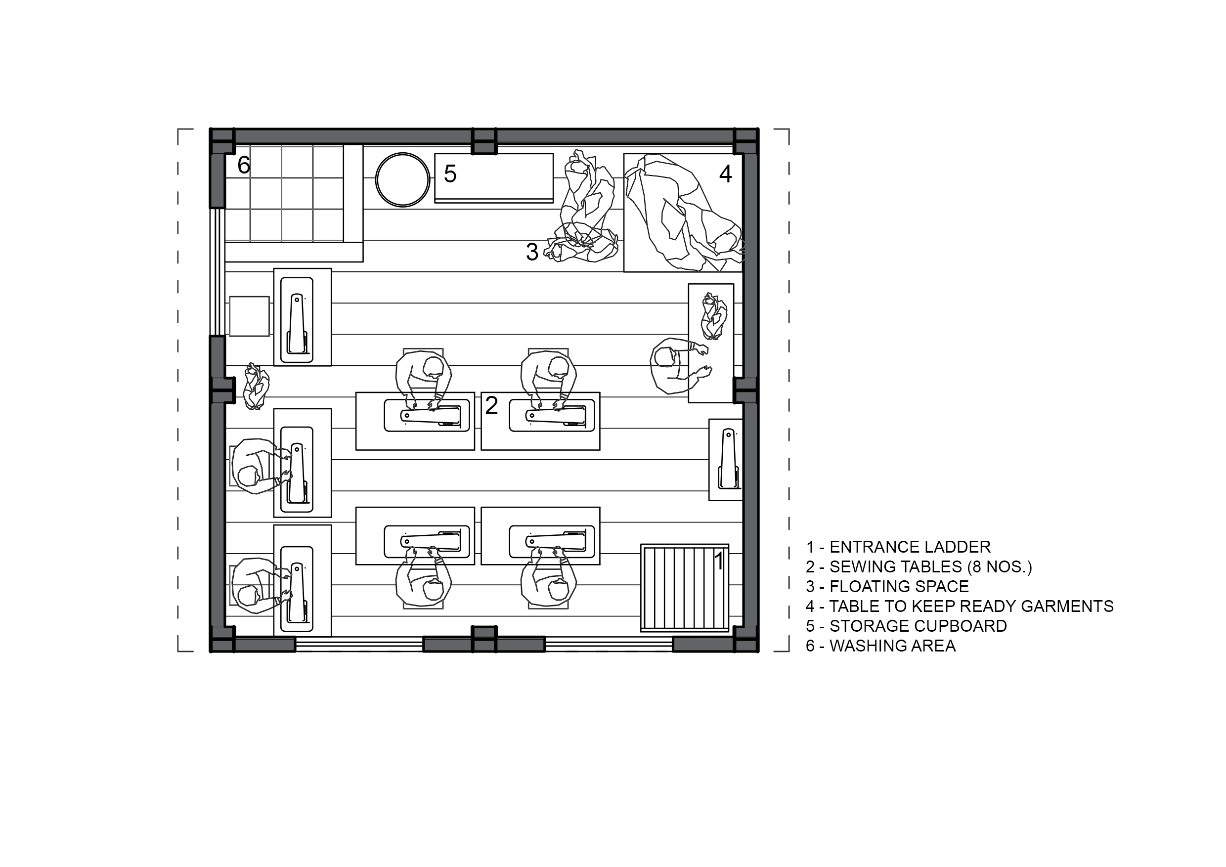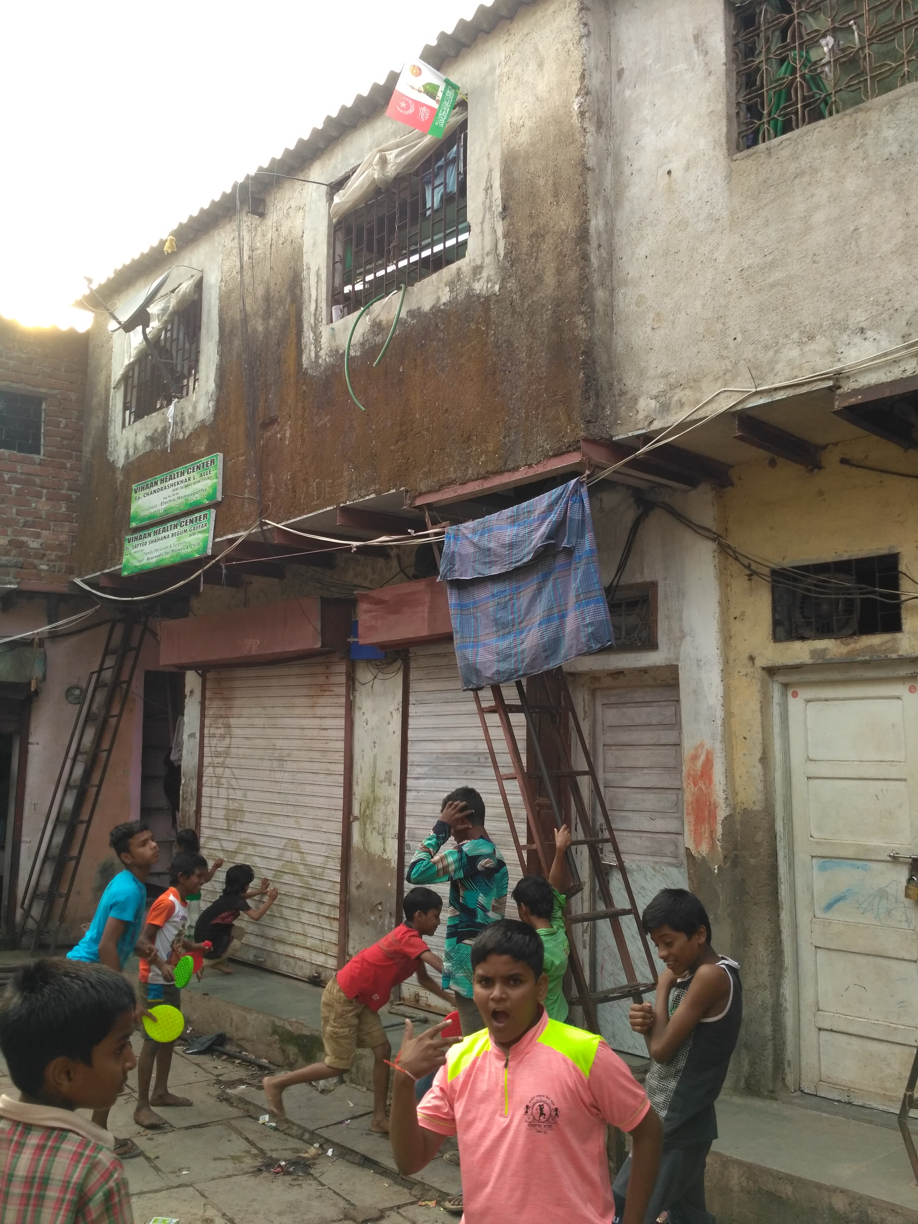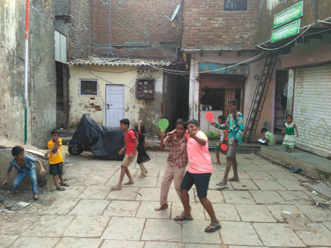 A small lane to the left from Dharavi depot road, towards Maharashtra Nature Park, opens up to a small open space with Muzaffar’s tool – house as a back drop. With children playing in the open area, and people using it for transition, it remains lively. An external ladder from the ground floor leads up to Muzaffar’s garment workshop which is a 225 sq. ft. area with 8 sewing machines and 7 workers, 3 to 4 of whom stay in the workshop at night for security purpose.