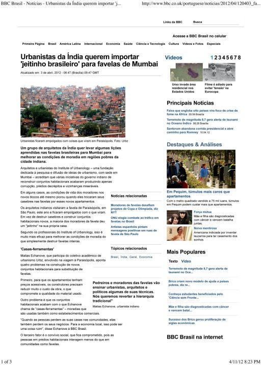 It was picked up and presented as an article published in BBC Brasil about what Mumbai could learn from Sao Paulo. It mentions our project for a Paraisopolis-Dharavi Institute of Urbanology next year. This institute began as a speculative exercise, a piece of fiction. For us, fiction is all about creative possibilities that are waiting to happen. It propels us into making new realities and conjuring them up is only the first step towards their actual realization. The Institute is tentatively visualized as a program in which urban practitioners of all kinds – architects, planners, activists and artists among others – from all over the world, come and learn from the residents, local builders, contractors and others from the neighbourhood of Paraisopolis. They learn about construction techniques, local architecture and several other aspects of urban life which are of relevance to people all over the world. Look out for future updates on this page.
