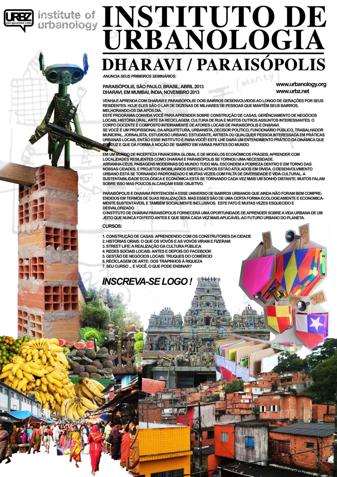 This weekend Mumbai meets Sao Paulo in Paraisopolis. We came with a special guest from Mumbai, Bhau Korde who has been a source of inspiration and guidance to the URBZ team since its inception. He will engage in debates and discussions with residents of Paraisopolis, this coming Saturday and Sunday. In addition, we are organizing a street exhibition on Dharavi, displaying 40 large posters showing scenes of every day life throughout the neighbourhood. We are also organizing a 3-day workshop on local construction practices with students of the Escola de Arquitectura de Sao Paulo. The students will be studying houses built by local masons (pedreiros) in Paraisopolis and learning directly from them. As part of our Dharavi-Paraisopolis exchange we are also proposing a Paraisopolis-Dharavi Institute of Urbanology to be held next year, where architects and public servants come and learn from residents (see poster).