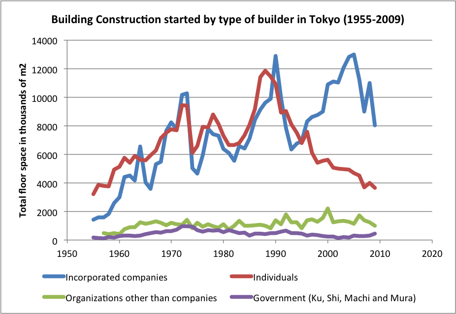 According to data from the Tokyo Metropolitan Government, from 1957 to 1996, non-incorporated individual landowners have built more floor space than large-scale corporate developers and the government together. Families who invested in their own homes and local contractors were the main agents of the urban development at the neighbourhood level. Thousands of local, non-incorporated builders and artisans specialized in small-scale construction.