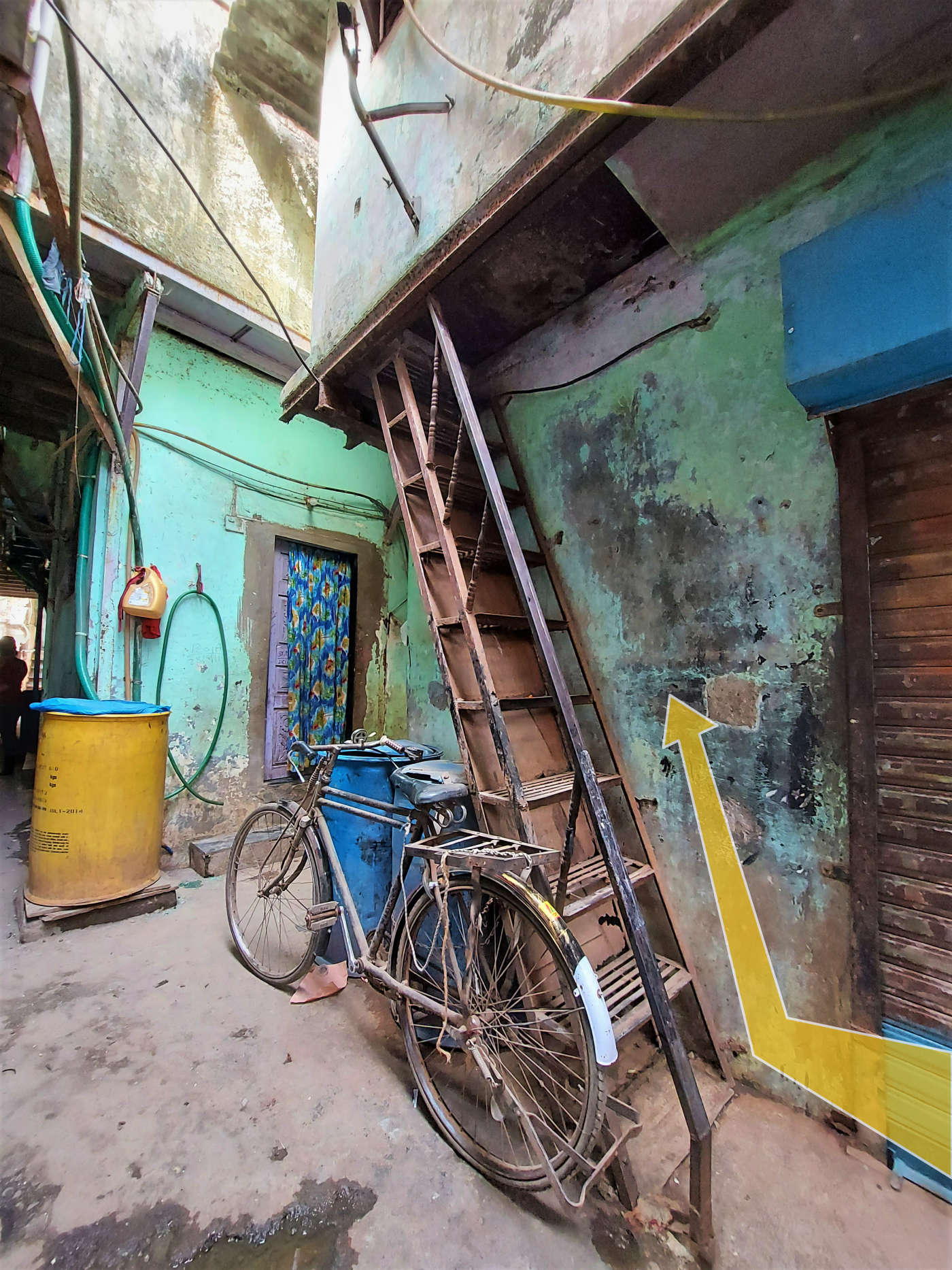 Straight flights lead to the upper storey with a clear aim of reaching the maximum height in minimum space. Moreover, the staircase structure is primarily governed by the ability to assemble quickly, optimize space, and cost. Given that space is a commodity in Dharavi, a comfortable stride is rather a symbol of grandeur. Here, the construction of a staircase is completely ad hoc, and their positioning on the street is generally an outcome of existing references. For anyone not familiar with this context, the arrangement might seem irregular, disorganized, and sometimes even chaotic. However, for the residents, these metal structures are extremely efficient in their purpose of facilitating ongoing economically-driven activities. “Aadat ka baat hai, roz karoge to aa jayega” (It is a matter of forming a habit, if you climb every day, you will eventually get comfortable) is what is generally suggested when one struggles to make an alliance with the steepness of the stride.