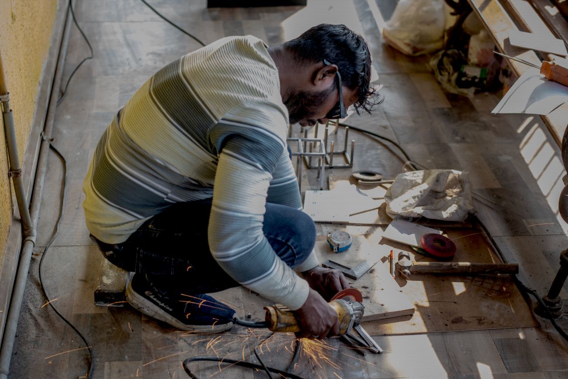 Kamlesh is a 29-year-old welder from Mau, a district in eastern Uttar Pradesh (U.P.), a state in northern India. He speaks Hindi and Bhojpuri at home. His wife, a homemaker, lives in UP with their two children. He visits them for four months in the year. Currently, he lives near Grant Road, having moved to Mumbai in 2018. His portfolio includes metal fabrication work for large commercial projects such as the Breach Candy Hospital and the Trident Hotel (Bandra-Kurla).