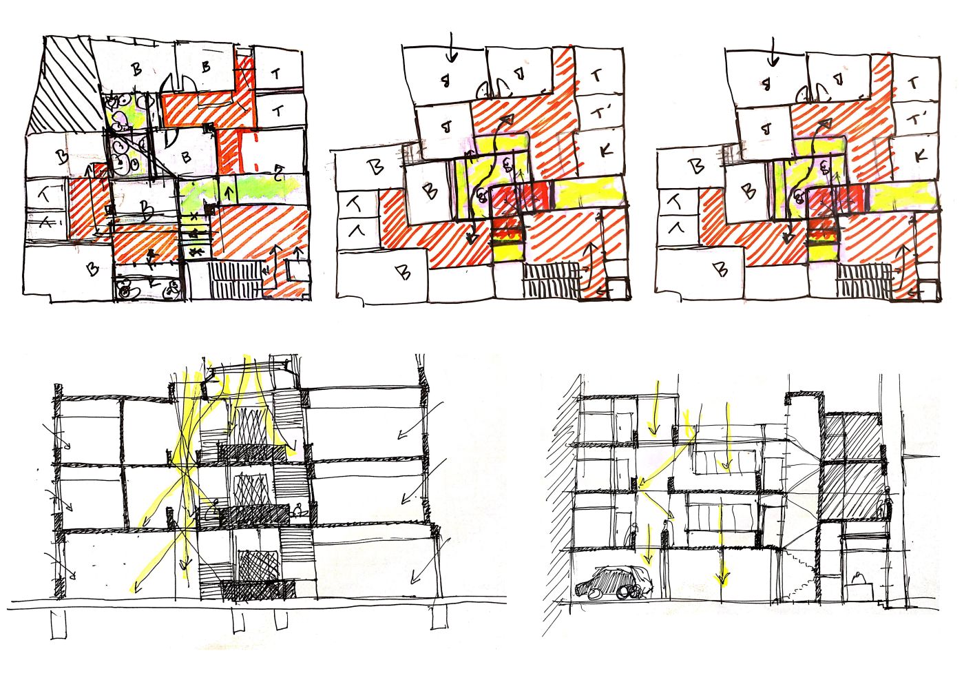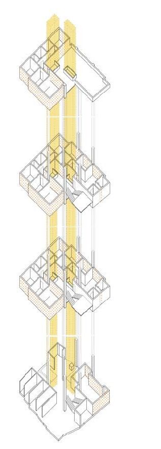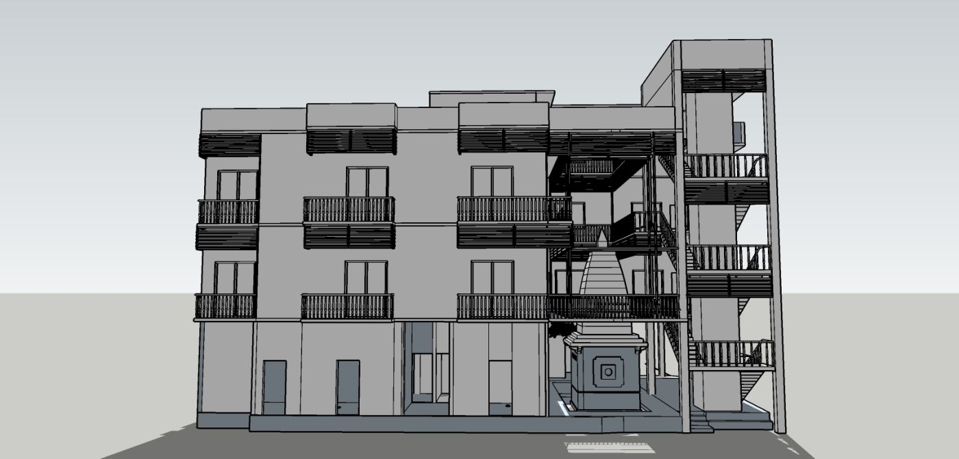On the ground floor, the area for the shops is retained along with the small residential units and space for four car parks. The vertical circulation, both the staircase and elevator, open up to a common living area on each floor. The area on each floor is equally divided into a total of eight studio apartments (30 Sq.mts each), four for each brother. Four of the units are accessed from the shared living room, the other four are accessed by a verandah off the shared living room and overlooking the courtyard.