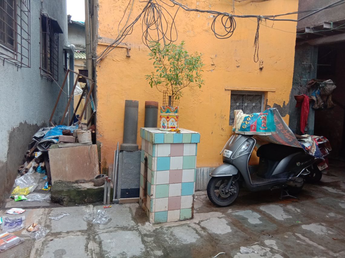 The Keny house is situated on Dharavi main road abutting the Koli Jamaat (community) building. Built incrementally, its earliest unit resembles the traditional chawl typology of Bombay comprising of a verandah running along the rooms that open onto it. Here, the verandah doubles up as a corridor giving access to a large central room and consecutive smaller rooms. Over the years, the house has been incrementally constructed to accommodate the new additions to the family which now comprises 38 individuals. The house is now three storeys tall. Currently, the total built area is unevenly distributed amongst the five brothers. In addition to the Keny residence, the ground floor also has a few shops and small residential units, which the Keny’s give out on rent. The main entrance of the Keny house opens into a small outdoor space holding the tulsi plant (the holy basil), this leads to a maze of narrow passages and staircases that effectively bring in slivers of light and breeze.