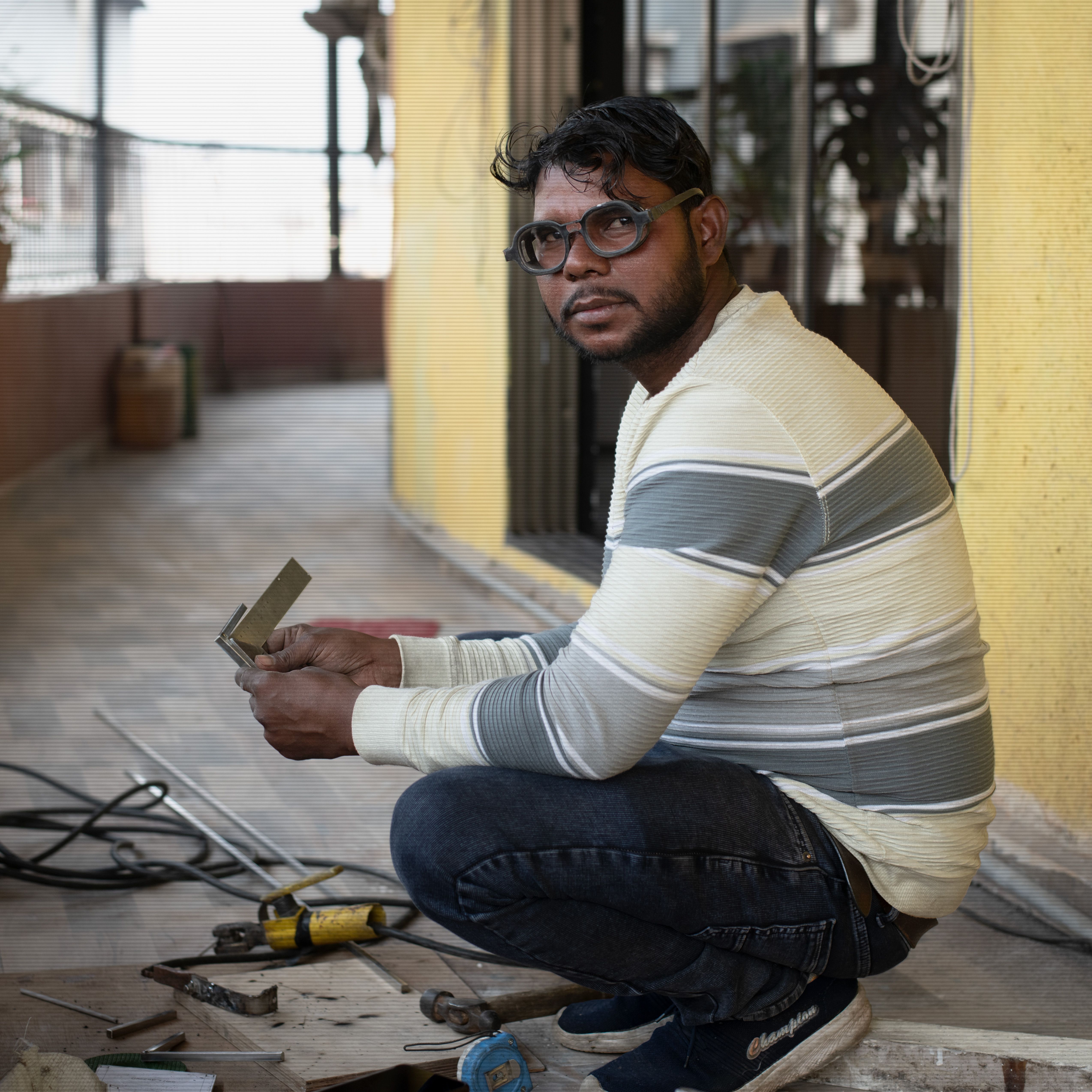 Kamlesh is a 29-year-old welder from Mau, a district in eastern Uttar Pradesh (U.P.), a state in northern India. He speaks Hindi and Bhojpuri at home. His wife, a homemaker, lives in UP with their two children. He visits them for four months in the year. Currently, he lives near Grant Road, having moved to Mumbai in 2018. His portfolio includes metal fabrication work for large commercial projects such as the Breach Candy Hospital and the Trident Hotel (Bandra-Kurla).