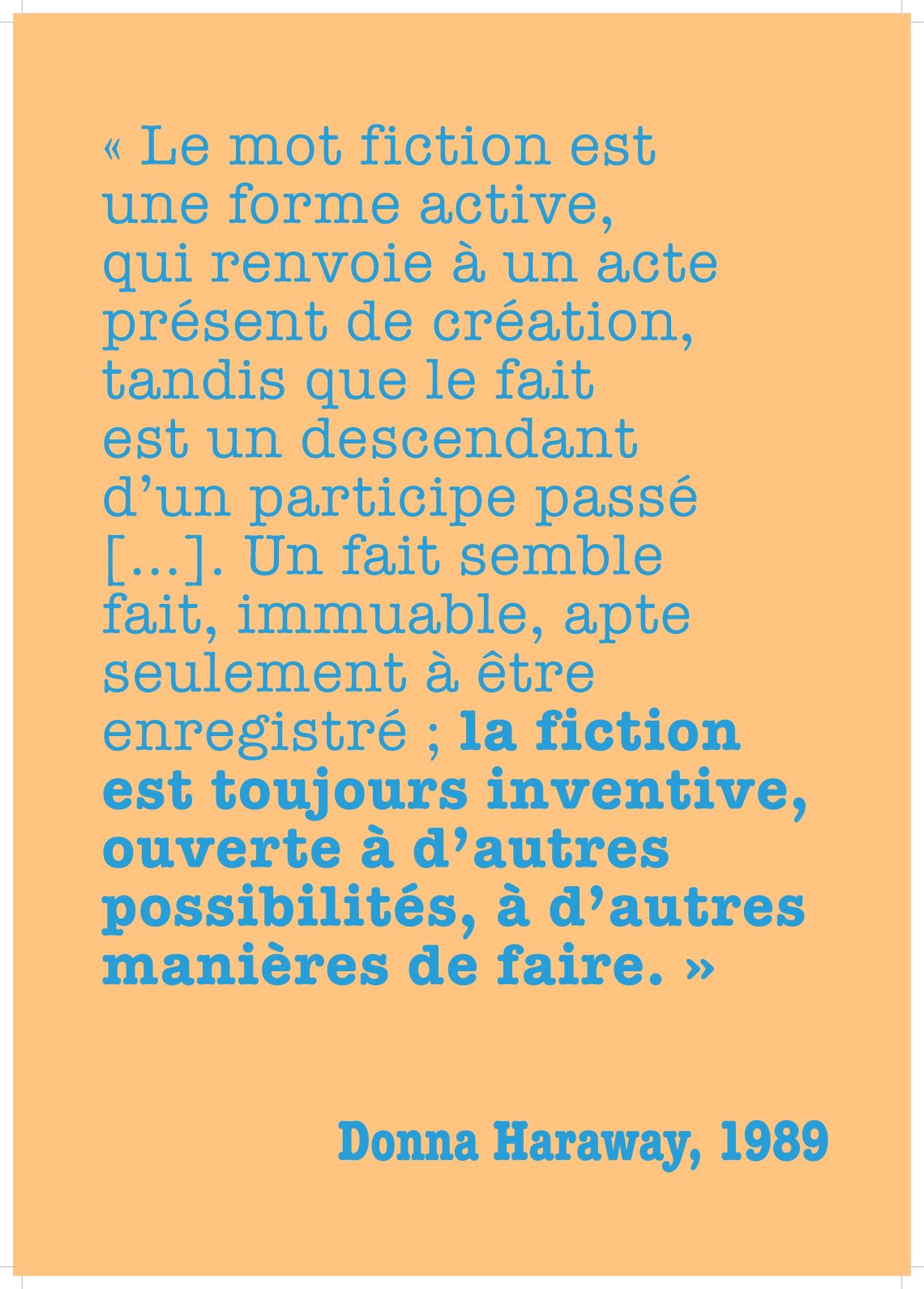 This convinces us of what Donna Haraway has suggested (which we heartily endorse) the word fiction is an active form, referring to a present act of fashioning, while fact is a descendant of a past participle, a word form which masks the generative deed or performance. A fact seems done, unchangeable, fit only to be recorded; fiction seems always inventive, open to other possibilities, other fashionings (Haraway 1989: 4)